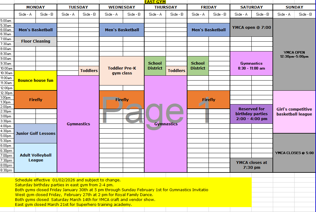 The YMCA has two full-size gymnasiums with six 10’ regulation hoops in each gym. Feel free to come in during open gym and shoot around. Basketballs are available to check out at the Front Welcome Desk with your Y Membership Card or day pass.